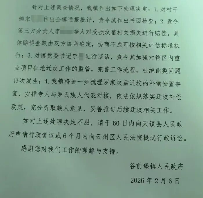 针对上述调查情况,谷前堡镇政府决定对村干部宋某某作出全镇通报批评,责令其作出书面检查;责令第三方负责人李某某等人对受损坟墓相关损失进行赔偿,具体赔偿金额由双方协商确定等;对镇党委书记李某进行谈话,责令其加强对辖区内重点项目征地迁坟工作的监管,完善工作流程等;该镇将进一步梳理迁坟补偿安置事宜,安排专人与罗氏族人代表对接,依法依规落实迁坟补偿政策,充分听取族人意见,妥善推进后续迁坟相关工作。