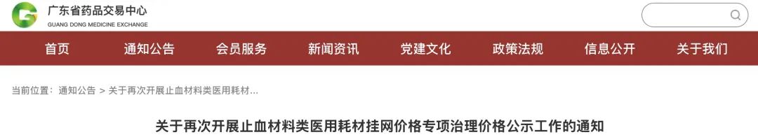 近日,广东省药品交易中心发布《关于再次开展止血材料类医用耗材挂网价格专项治理价格公示工作的通知》(简称《通知》)。